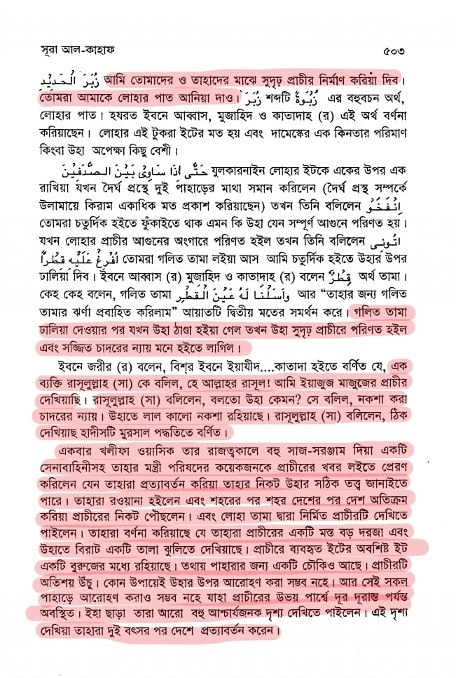 “অবশেষে যখন তিনি দুই পর্বত প্রাচীরের মধ্যস্থলে পৌঁছলেন, তখন তিনি সেখানে এক জাতিকে পেলেন, যারা তাঁর কথা একেবারেই বুঝতে পারছিল না। তারা বলল, হে যুল-কারনাইন, ইয়াজুজ ও মাজুজ দেশে অশান্তি সৃষ্টি করছে। আপনি বললে আমরা আপনার জন্য কিছু কর ধার্য করব এ শর্তে যে, আপনি আমাদের ও তাদের মধ্যে একটি প্রচীর নির্মাণ করে দিবেন। তিনি বললেন, আমার রব আমাকে যে সামর্থ্য দিয়েছেন, তাই যথেষ্ট। অতএব, তোমরা আমাকে শ্রম দিয়ে সাহায্য কর। আমি তোমাদের ও তাদের মাঝে একটি সুদৃঢ় প্রাচীর নির্মাণ করে দিব। তোমরা আমাকে লোহার পাত এনে দাও। অবশেষে যখন পাহাড়ের মধ্যবর্তী ফাঁকা স্থান পূর্ণ হয়ে গেল, তখন তিনি বললেন, তোমরা হাঁপরে ফুঁক দিতে থাক। অবশেষে যখন তা আগুনে পরিণত হলো, তখন তিনি বললেন, তোমরা গলিত তামা নিয়ে আস। আমি তা এর উপর ঢেলে দেই। অতঃপর ইয়াজুজ ও মাজুজের দল তার উপরে আরোহণ করতে পারল না এবং তা ভেদ করতেও সক্ষম হলো না। -কারনাইন বললেন, এটা আমার রবের অনুগ্রহ। যখন আমার রবর প্রতিশ্রুত সময় আসবে, তখন তিনি একে চূর্ণ-বিচূর্ণ করে দেবেন এবং আমার রবের প্রতিশ্রুতি সত্য।” ( সূরা কাহাফ, আয়াত: ৯৩-৯৮ )